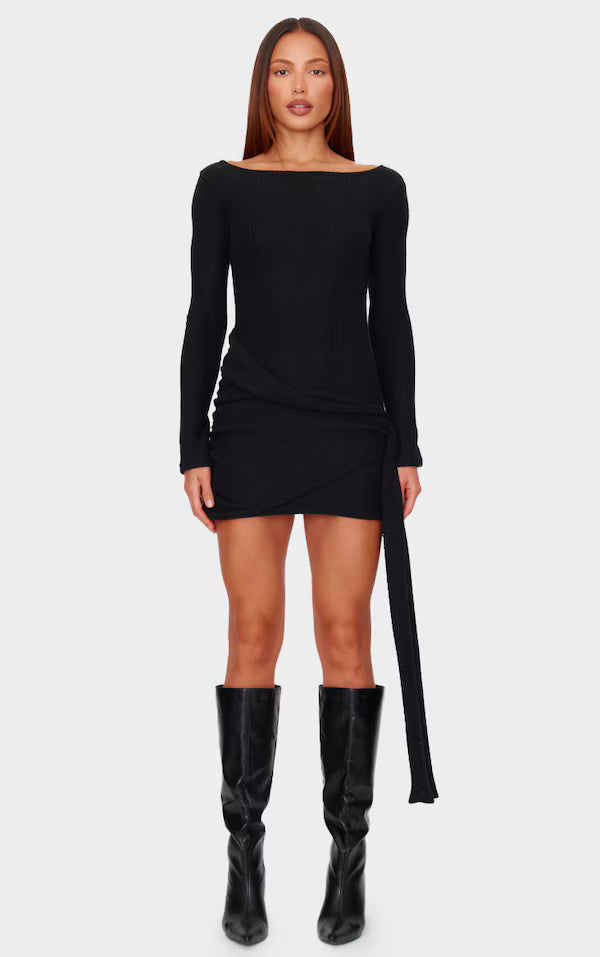 Elevate your after-dark edit with this bodycon dress, rendered in a brushed rib fabrication. The tie-waist detail allows you to cinch the silhouette to your preference, creating a flattering shape. The black hue offers endless styling possibilities. Accessorise with a delicate gold chain from our jewellery collection for a considered, contemporary finish.