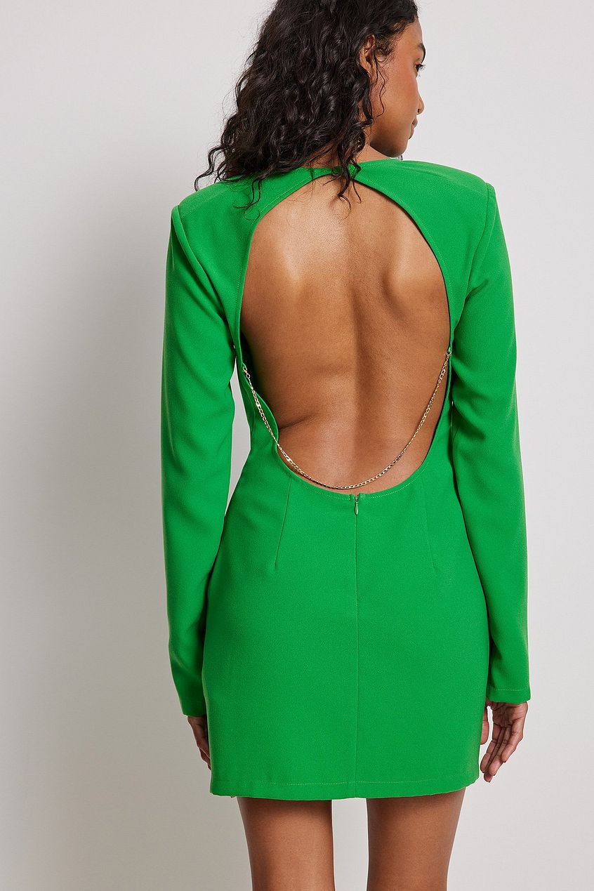 This mini dress features long sleeves, an open back with a button closure and a chain detail and a back zip closure. This mini dress comes in green.