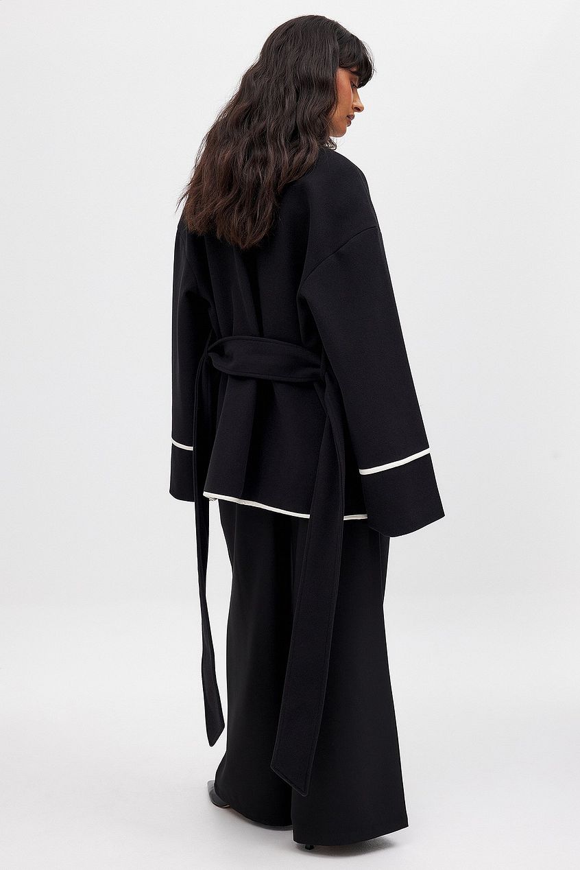 This coat features a short fit and an overlap style with a self tie waist belt. It has open side seam pockets and contrast-colored seam details. This coat comes in black.