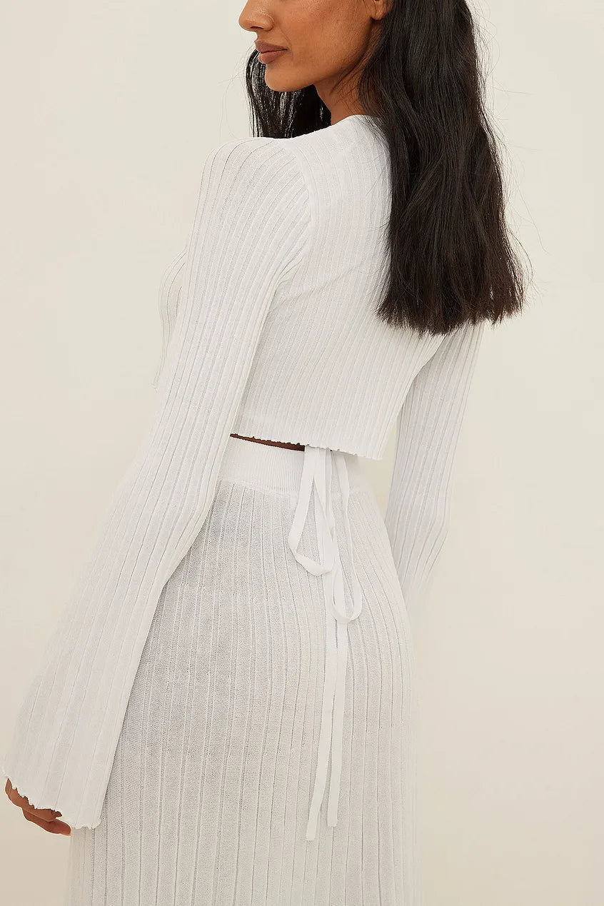 This top is ribbed and cropped and features a wrap design with a self-tie knot at the waist and long trumpet sleeves. This top comes in white.
