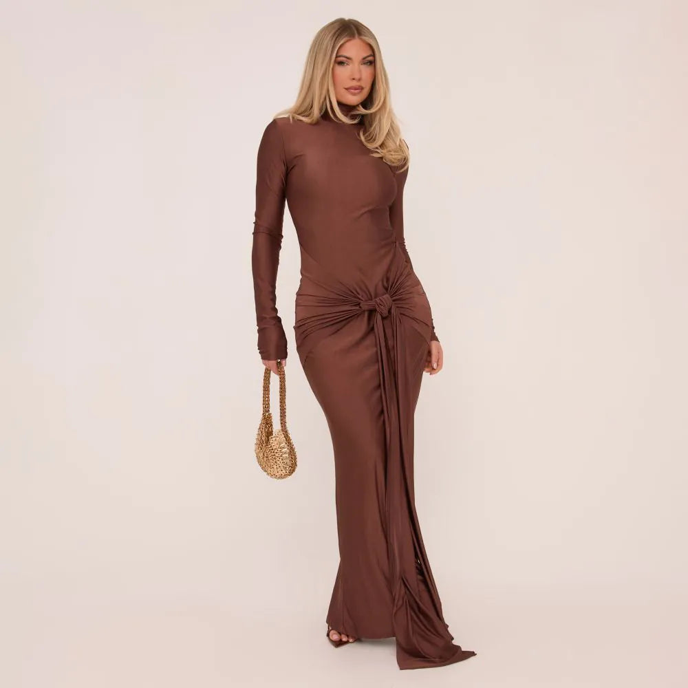 Long Sleeve High Neck Drape Waist Detail Maxi Dress In Chocolate Brown Slinky