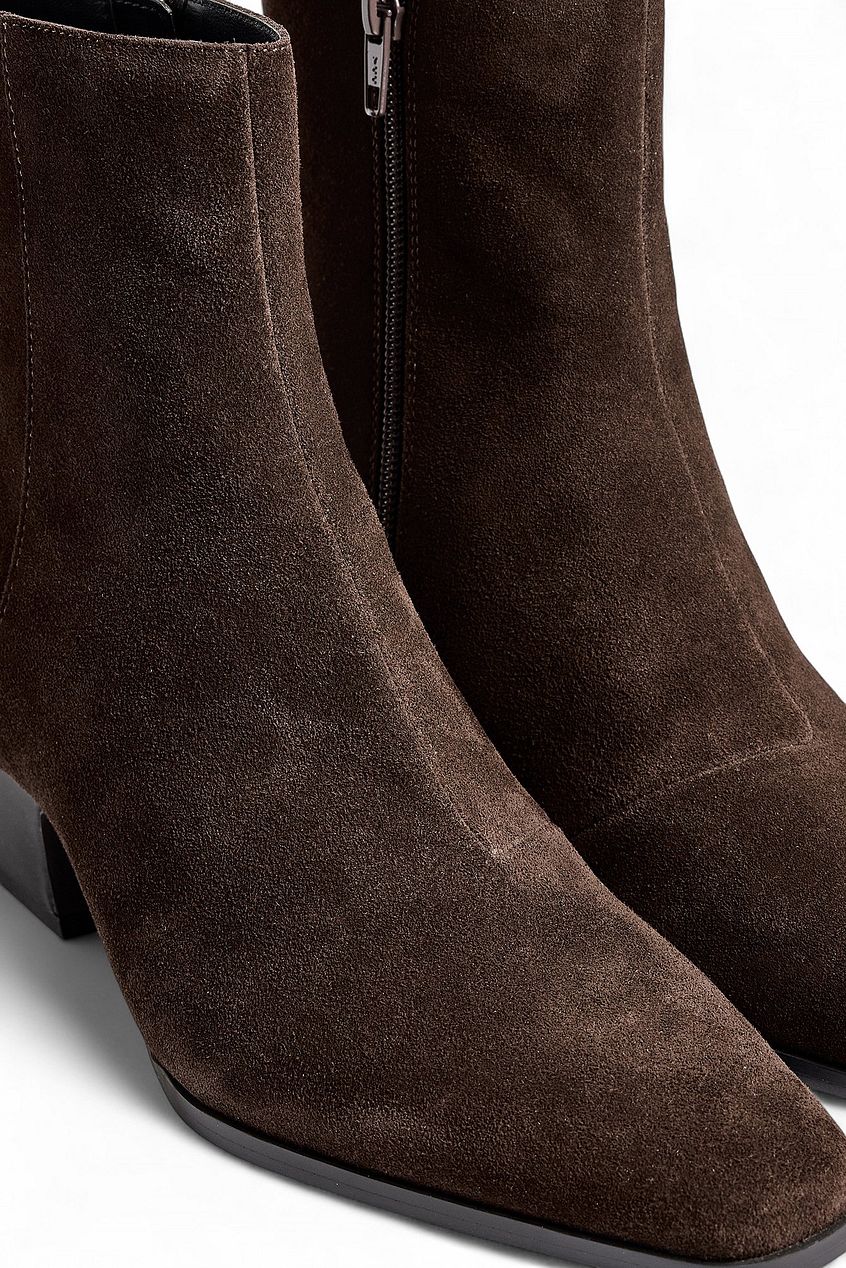 This ankle boot is made of suede and features a soft feel and a square pointed toe. It has a slanted block heel and a zip closure on the side. Measurements in size EU 39: Sole height: 0.7 cm / 0.27 in. Heel height: 6 cm / 2.36 in. Shaft height: 15 cm / 5.9 in. Shaft circumference around the calf: 26 cm / 10.2 in. This ankle boot comes in brown.