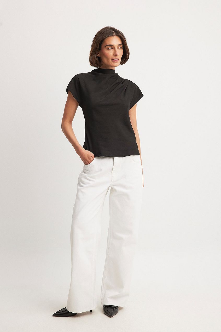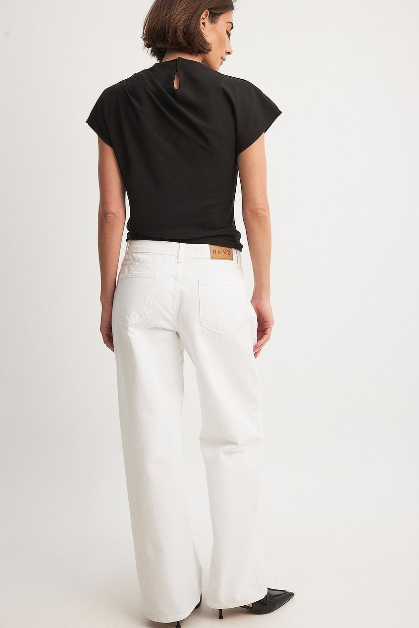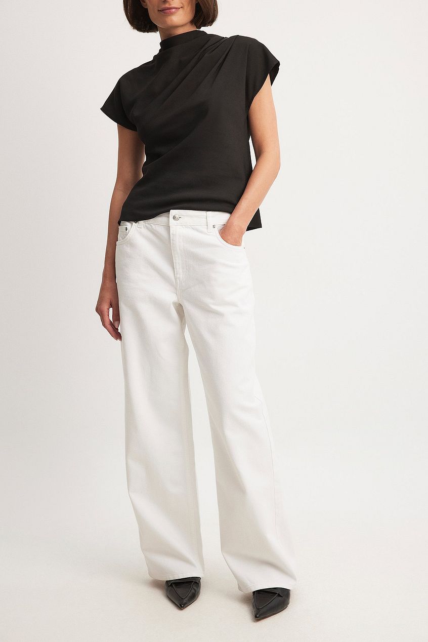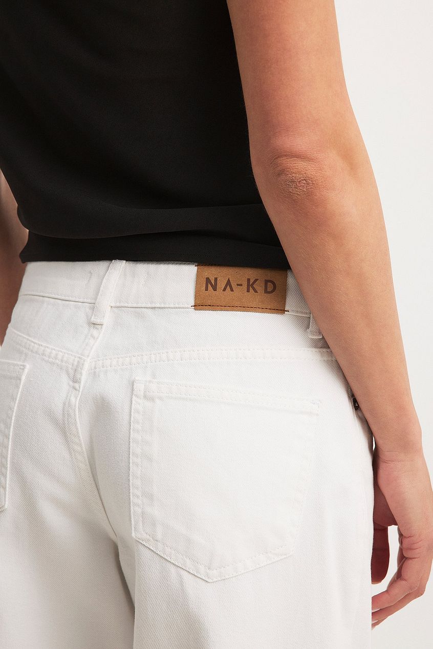 These jeans feature an oversized fit. They have a non-stretchy material and a mid waist. The jeans have belt loops, a zip and button closure and a five-pocket design. These jeans comes in white.