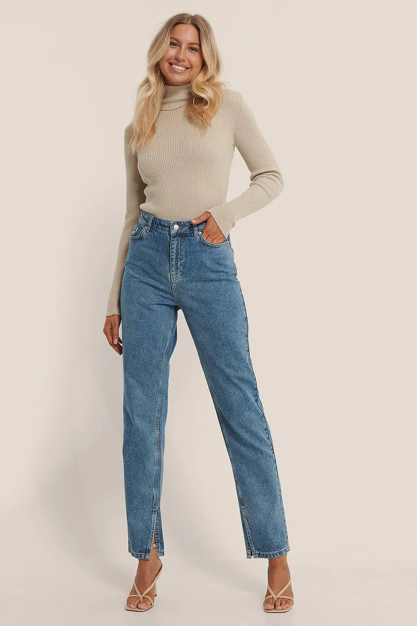 These jeans feature a high rise waist. They have a five-pocket design and a zip and button closure. These jeans feature side slits at the bottom hem and a straight fit. These jeans come in blue.
