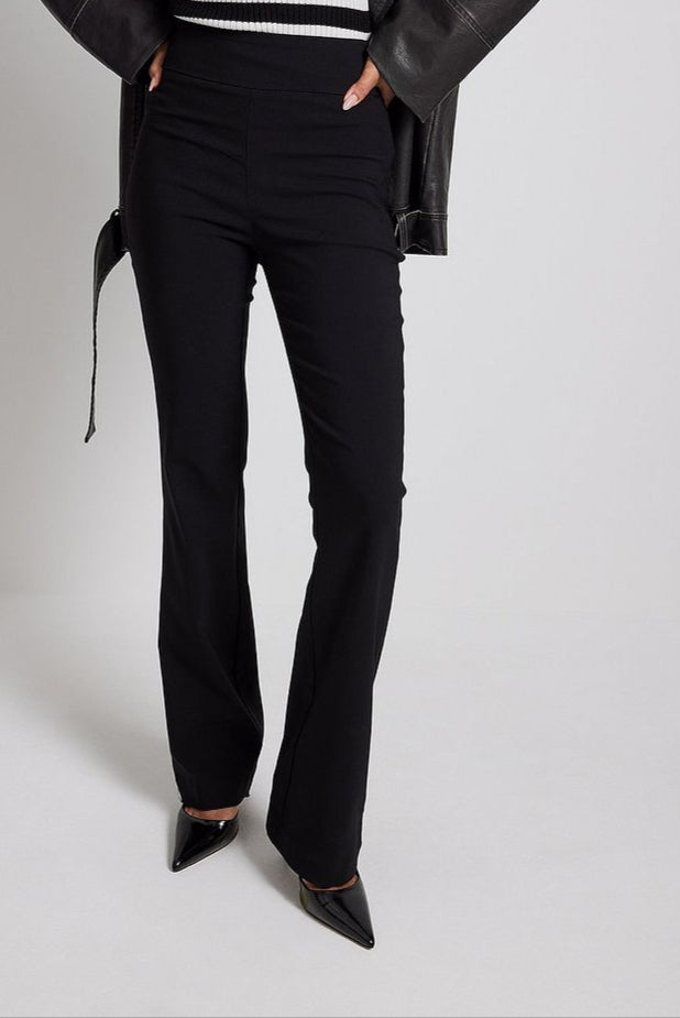 These trousers feature a wide high waist. They have a side zipper and a flared leg. These trousers feature a stretchy material. Inseam length in size 36: 82 cm / 32.28 in. These trousers comes in black.