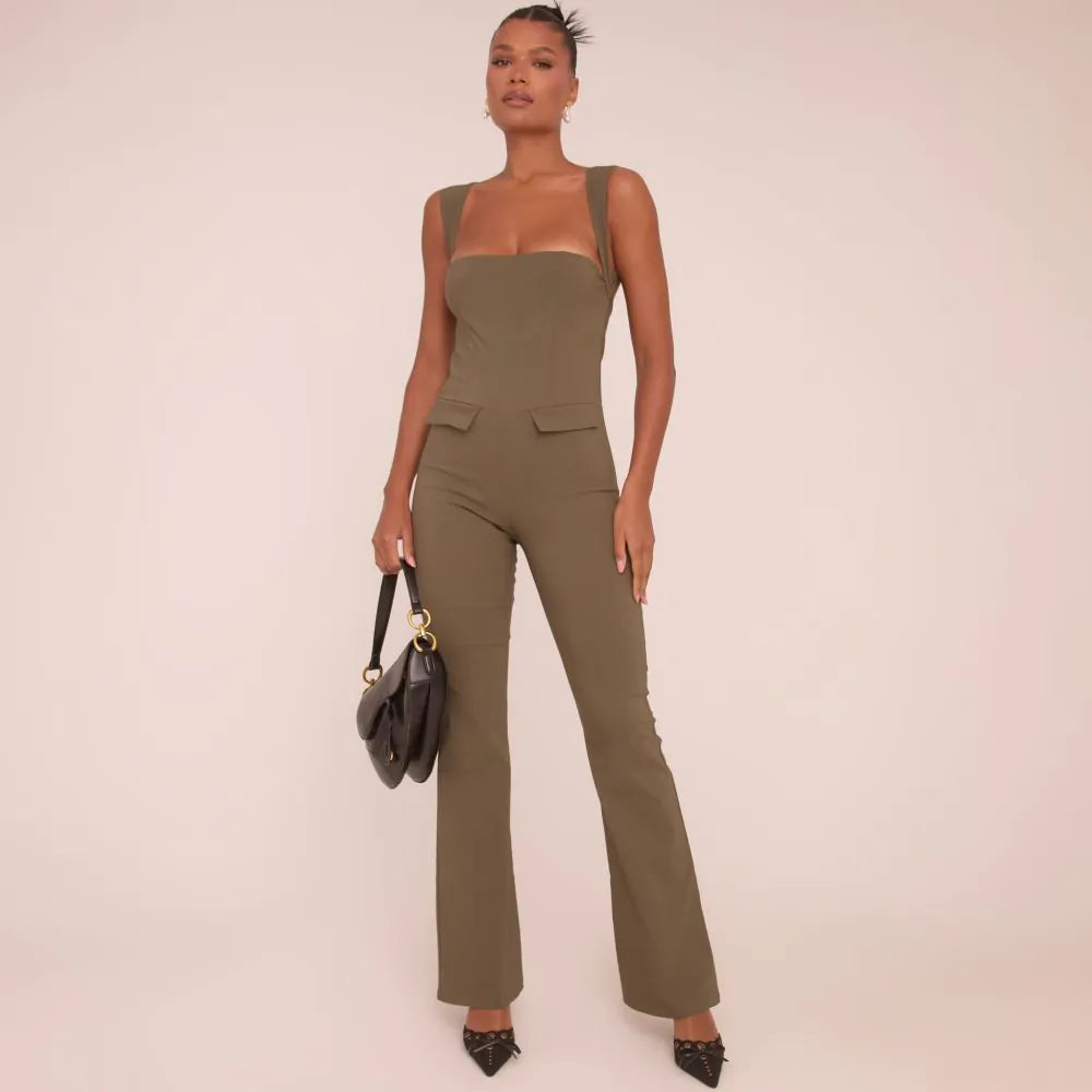 Look effortlessly chic in this Square Neck Tailored Flared Jumpsuit In Khaki Green Woven. This green tailored jumpsuit boasts a square neck and flattering flared legs in a dreamy khaki fabric. The pocket details add a tailored touch, making this jumpsuit your new chic, statement piece. Pair with strappy heels and a sleek shoulder bag for iconic vibes!