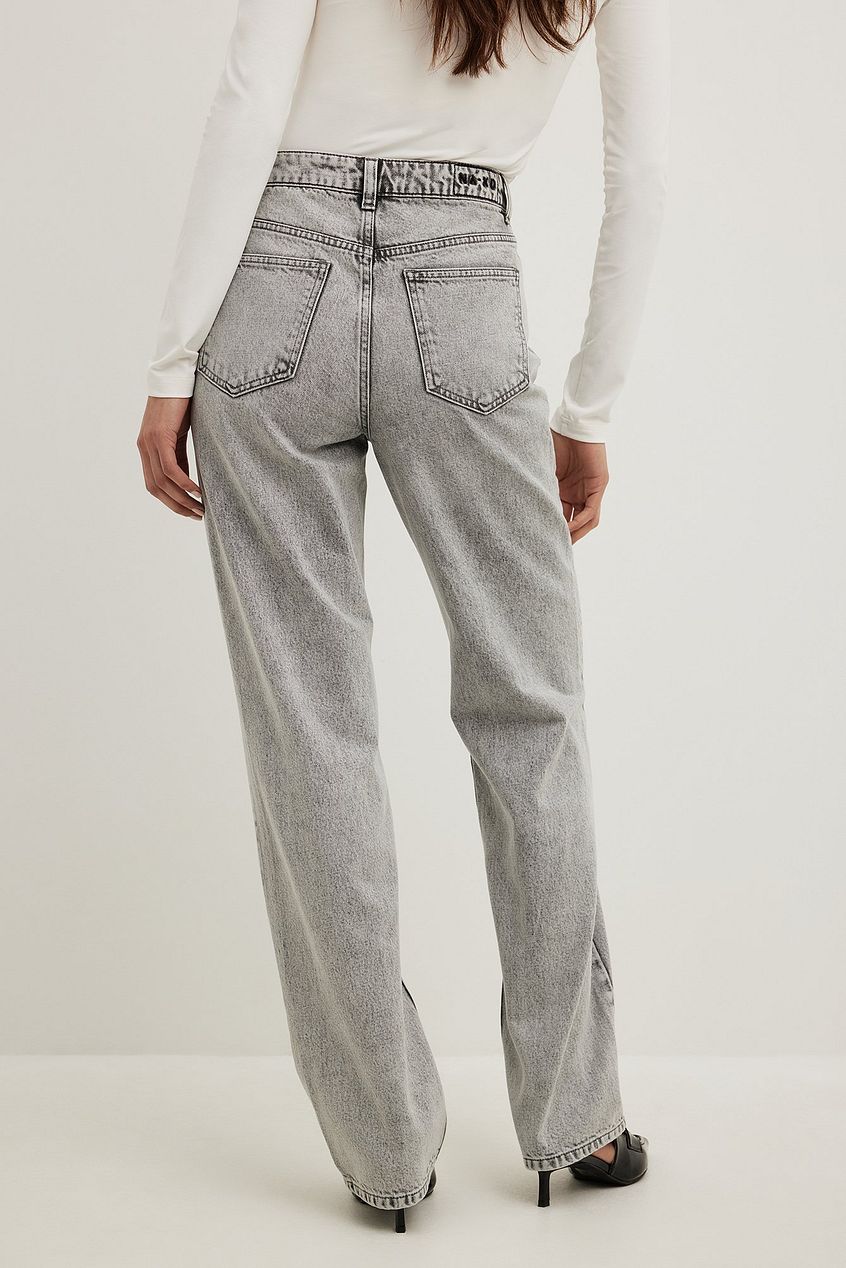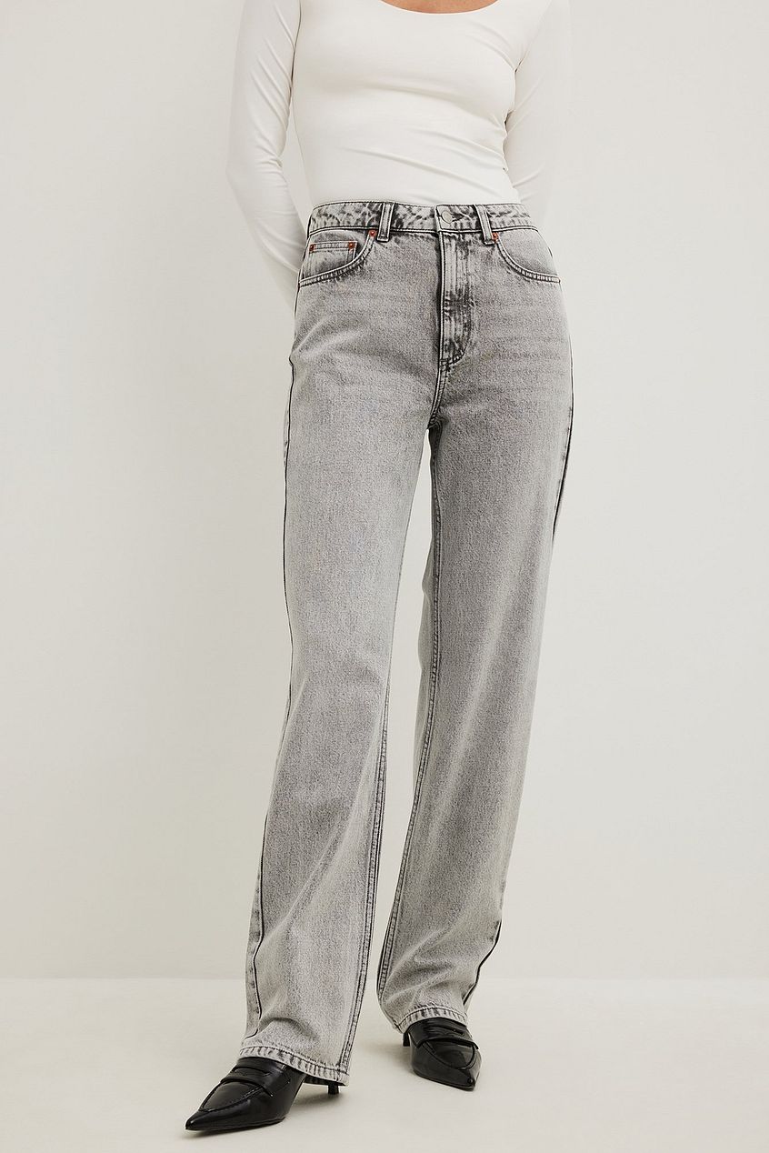 These jeans feature a straight fit. They have a high waist and denim material. The jeans have a five-pocket design and a zipper and button closure. Inseam Length in Size 36: 81 cm / 31.88 in. Waist in Size 36: 35 cm / 13.77 in. Seat in Size 36: 47 cm / 18.5 in. The color of this product may transfer to itself or other objects. Avoid making contact with light-colored surfaces. These jeans comes in grey.