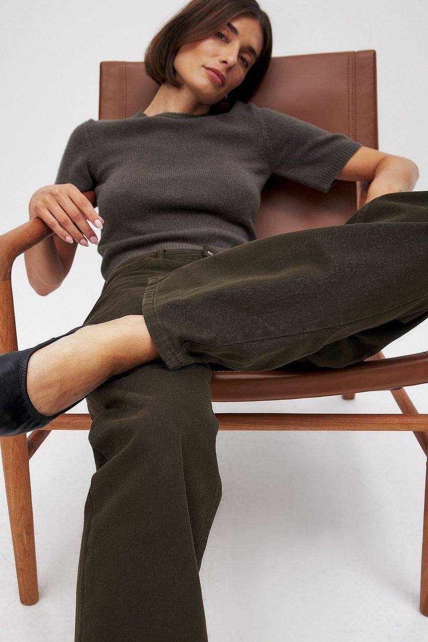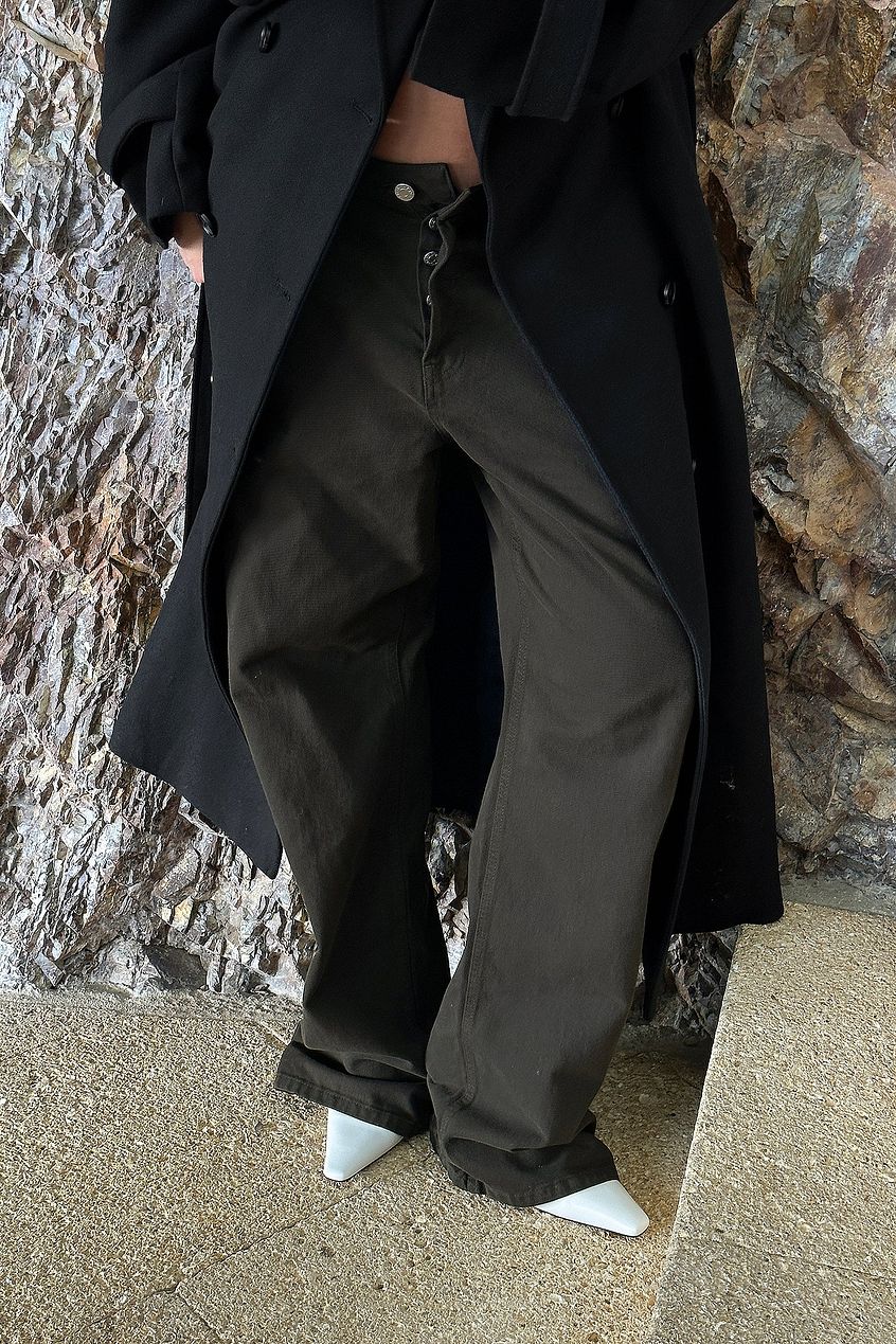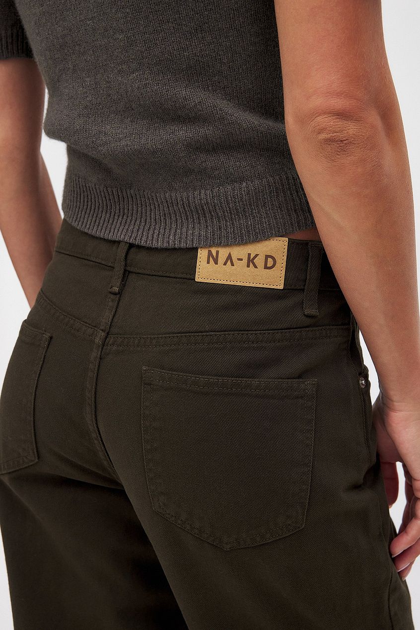 These jeans feature a straight loose fit. They have a mid waist and a five-pocket design. The jeans have a zipper and a button closure. The color of this product may transfer to itself or other objects. Avoid making contact with light-colored surfaces. These jeans comes in brown.