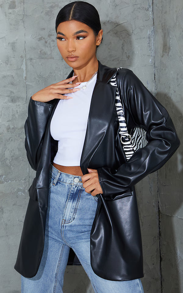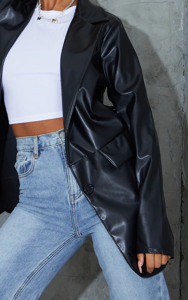 Elevate your tailoring game with this black PU blazer, a contemporary take on a classic silhouette. Crafted from supple faux leather, this piece offers a sharp, structured look with its double-breasted fastening and subtle pocket detailing. The clean lines and refined finish make it a versatile addition to your wardrobe. Style yours with tailored trousers from our bottoms collection for a confident, boardroom-ready ensemble or with wide leg jeans for an elevated casual style.