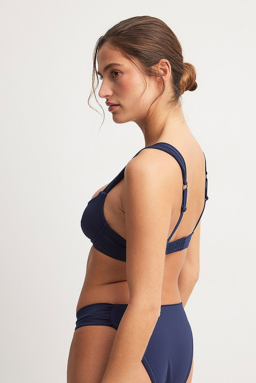 This bikini panty features a high cut leg and wide side straps. It has a stretchy material and a gathered detail on the sides. This bikini panty comes in navy.
