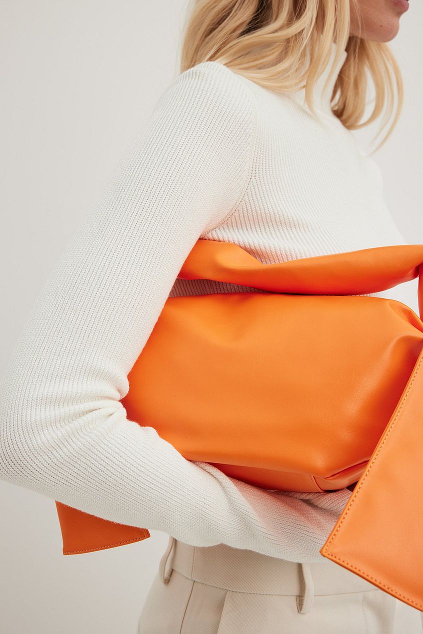 This handbag features a padded, non adjustable strap with knot details. It has a zipper closure and a main compartment with an open inner pocket and an inner pocket with a zipper. This handbag features a side pocket and a structured, rounded design. Measurements: Height: 12,5 cm / 4.9 in. Width: 12 cm / 4.7 in. Length: 31 cm / 12.2 in. Strap length: 47 cm / 18.5 in. This handbag comes in orange.