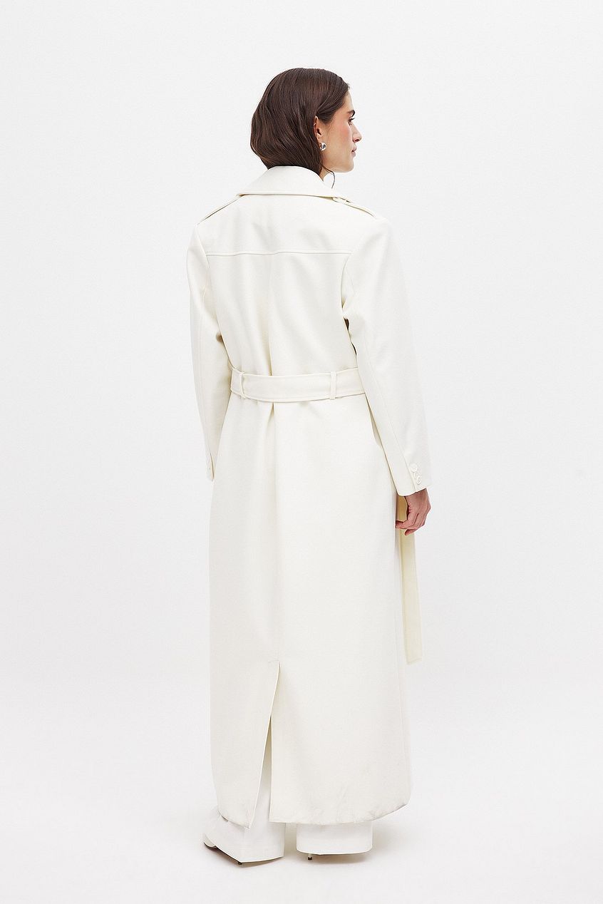 This coat is long and features shoulder pads and front flap pockets. It has a back slit detail and a double-breasted button closure with a self-tie belt. This coat comes in off-white.