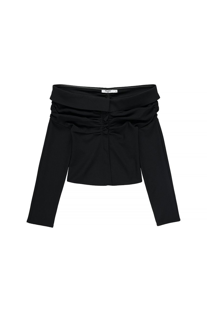 This top features a woven material. It has an off shoulder look with an inner silicone trim and long sleeves. This top features rouched details and a button closure down the front. This top comes in black. Influencer: @paola_cossentino is 168 cm tall and is wearing size EU 36 (UK 10, US 6, small).