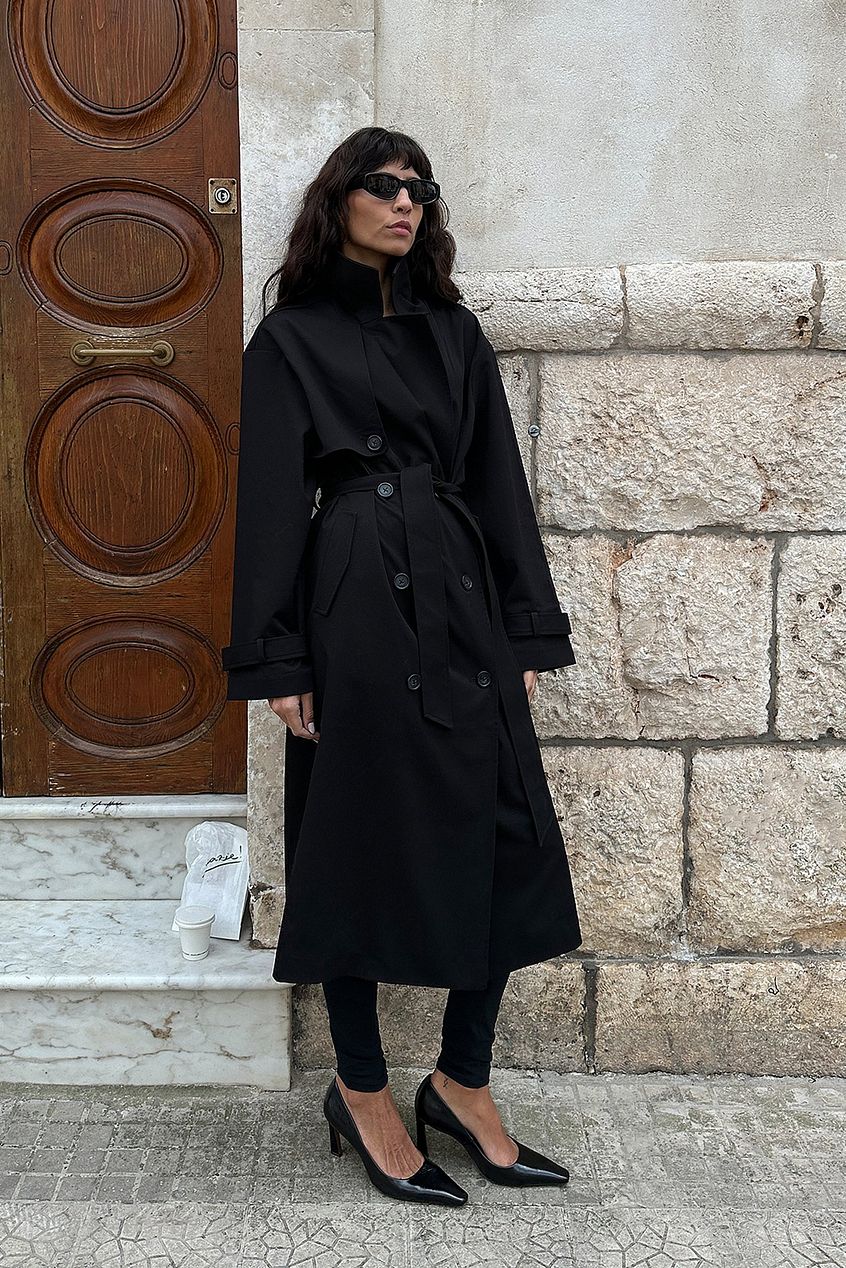 This trenchcoat features an oversized fit. It has a lapel neckline and a double-breasted button design. The trenchcoat has side pockets and a slit on the back. This trenchcoat comes in black.