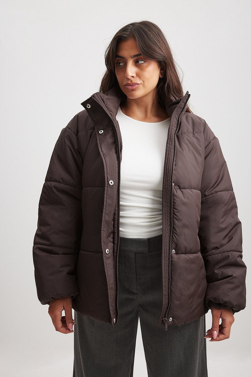 This padded jacket features a short fit and a high neck. It has gathered cuffs and a self-tie belt with belt loops. Our padded jacket features open welt side pockets and a zipper closure down the front with a concealed snap button closure. This padded jacket comes in brown.